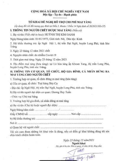 Tờ trình về việc chi trả cho cơ sở thực hiện xử lý thi hài người bị áp dụng các biện pháp cách ly y tế tử vong do nhiễm Covid-19 trên địa bàn huyện Long Phú